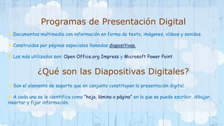 Los programas de presentación digital como PowerPoint y OpenOffice Impress usan diapositivas multimedia para presentar información en forma de texto, imágenes, video y sonido. Las diapositivas digitales proveen una plataforma flexible para visualizar y combinar datos gráficos y texto de manera sencilla. PowerPoint fue inventado en 1984 y adquirido por Microsoft en 1987, convirtiéndose en el programa de presentaciones más popular luego de nueve versiones.