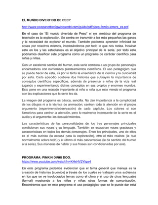 Este documento analiza varios programas de televisión infantiles y su potencial uso pedagógico. Describe programas como "Matemonstruos", "El mundo divertido de Peep" y "Dora la exploradora", destacando que enseñan conceptos académicos como las matemáticas y la ciencia de manera lúdica. También expone que estos programas pueden ayudar a desarrollar valores, habilidades sociales y cognitivas en los niños. Finalmente, discute el impacto positivo que pueden tener los medios de comunic