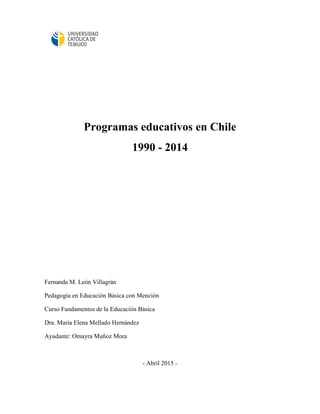 Este documento resume varios programas educativos implementados en Chile entre 1990 y 2014, incluyendo programas de alfabetización, educación intercultural, entrega gratuita de libros de texto, mejoramiento de la calidad de la educación secundaria, y apoyo a la educación de niños pequeños y sus familias.