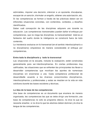 El documento discute los programas escolares y competencias. Explica que las competencias están ligadas a prácticas sociales complejas y que la escuela debe enfocarse tanto en formar competencias como en transferir conocimientos. También describe que las competencias no necesariamente se refieren a prácticas profesionales específicas, sino que evocan prácticas instituidas o emergentes. Finalmente, señala que las competencias transversales están ligadas a las competencias disciplinares pues se encuentran en la intersección de diferentes disciplinas.