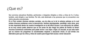 Los programas no escolarizados son servicios educativos flexibles dirigidos a niños de 0 a 5 años y sus familias que no tienen acceso a educación escolarizada. Estos programas representan una alternativa para ampliar la cobertura educativa en zonas rurales y marginales con altos niveles de pobreza, desnutrición y falta de servicios. Su finalidad es promover prácticas de crianza que contribuyan al desarrollo integral de los niños desde una perspectiva socioafectiva, cognitiva y de respeto a sus derechos. Existen diversos
