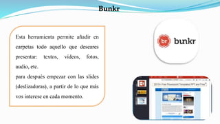 El documento presenta diversas herramientas para crear presentaciones, destacando sus características y usos específicos. Incluye opciones como Canva, Google Slides y Prezi, cada una con funciones únicas que facilitan la creación y personalización de presentaciones. Se menciona la facilidad de uso de algunas plataformas y la disponibilidad de versiones gratuitas o de pago.