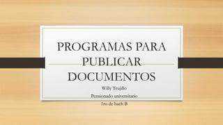 Este documento describe diferentes programas para publicar documentos. Slideshare permite a los usuarios subir y compartir presentaciones de diapositivas, documentos y PDFs de manera pública o privada. Slideboom permite crear presentaciones de fotos, video y audio. Scribd permite a los usuarios publicar y compartir documentos de forma pública o privada.