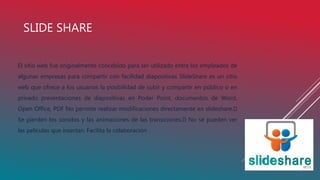 Este documento resume las características y diferencias entre varias plataformas para publicar y compartir presentaciones y documentos. SlideShare permite subir presentaciones de PowerPoint pero pierde sonidos y animaciones, mientras que SlideBoom solo acepta formato PPT de hasta 30MB. Scribd acepta más formatos como Word y PDF y permite escuchar documentos. Las principales diferencias entre las plataformas son los formatos admitidos, tamaños máximos y funciones como audio.
