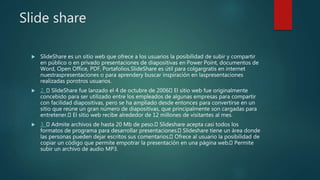 SlideShare permite compartir presentaciones de diapositivas en línea de forma gratuita. Slideboom también permite compartir presentaciones y documentos de OpenOffice de forma gratuita. Scribd permite publicar y compartir todo tipo de documentos y los usuarios pueden comentarlos y votarlos. SlideShare y Slideboom se diferencian principalmente en el tamaño máximo de archivo que admiten y si requieren suscripción de pago para funciones avanzadas, mientras que Google Drive y SlideShare se diferencian en la cantidad de información que pueden almacenar