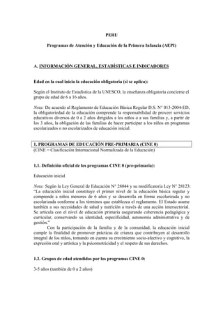 Este documento presenta información sobre los programas de atención y educación de la primera infancia en Perú. Proporciona detalles sobre la educación pre-primaria y otros programas para niños de 0 a 5 años, incluidas estadísticas sobre matrícula, docentes y financiamiento. También describe el marco legal que rige estos programas y las diferentes modalidades de atención escolarizada y no escolarizada disponibles para los niños pequeños en Perú.