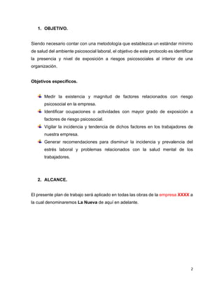 Este documento presenta un programa de vigilancia de factores psicosociales en el trabajo. Establece objetivos como medir la exposición a riesgos psicosociales e identificar áreas de mayor riesgo. Describe las responsabilidades de gerentes, supervisores y trabajadores en la aplicación del programa. También detalla las actividades como conformar un comité, capacitar al personal, aplicar cuestionarios, analizar resultados e implementar medidas correctivas. El seguimiento incluye evaluar la efectividad de las medidas y reevaluar periódicamente.