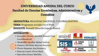 Este documento describe varios programas sociales implementados en Perú, incluyendo Qali Warma, Juntos y Foncodes. Qali Warma busca proporcionar alimentación escolar de calidad a niños. Juntos otorga apoyo económico condicionado a familias pobres para promover el acceso a servicios de salud y educación. Foncodes genera oportunidades económicas sostenibles para hogares rurales pobres.
