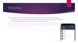 Este documento presenta resúmenes de varias aplicaciones de mensajería e Internet como WhatsApp, Skype, Zoom, Google Meet, FaceTime, Line, Facebook, MSN Messenger, Facebook Messenger, describiendo brevemente sus funciones y orígenes. Se incluyen también las fuentes consultadas que son Wikipedia y SlideShare.