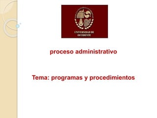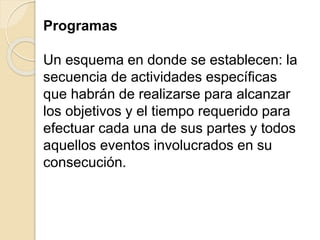 Los programas establecen la secuencia de actividades y el tiempo requerido para alcanzar los objetivos de una organización, sirviendo como herramienta de control. Los procedimientos determinan el orden lógico para realizar actividades rutinarias de manera eficiente. Tanto los programas como los procedimientos son importantes para orientar a los trabajadores, identificar responsabilidades, evitar duplicidad de esfuerzos y lograr los objetivos de una organización de manera ordenada.