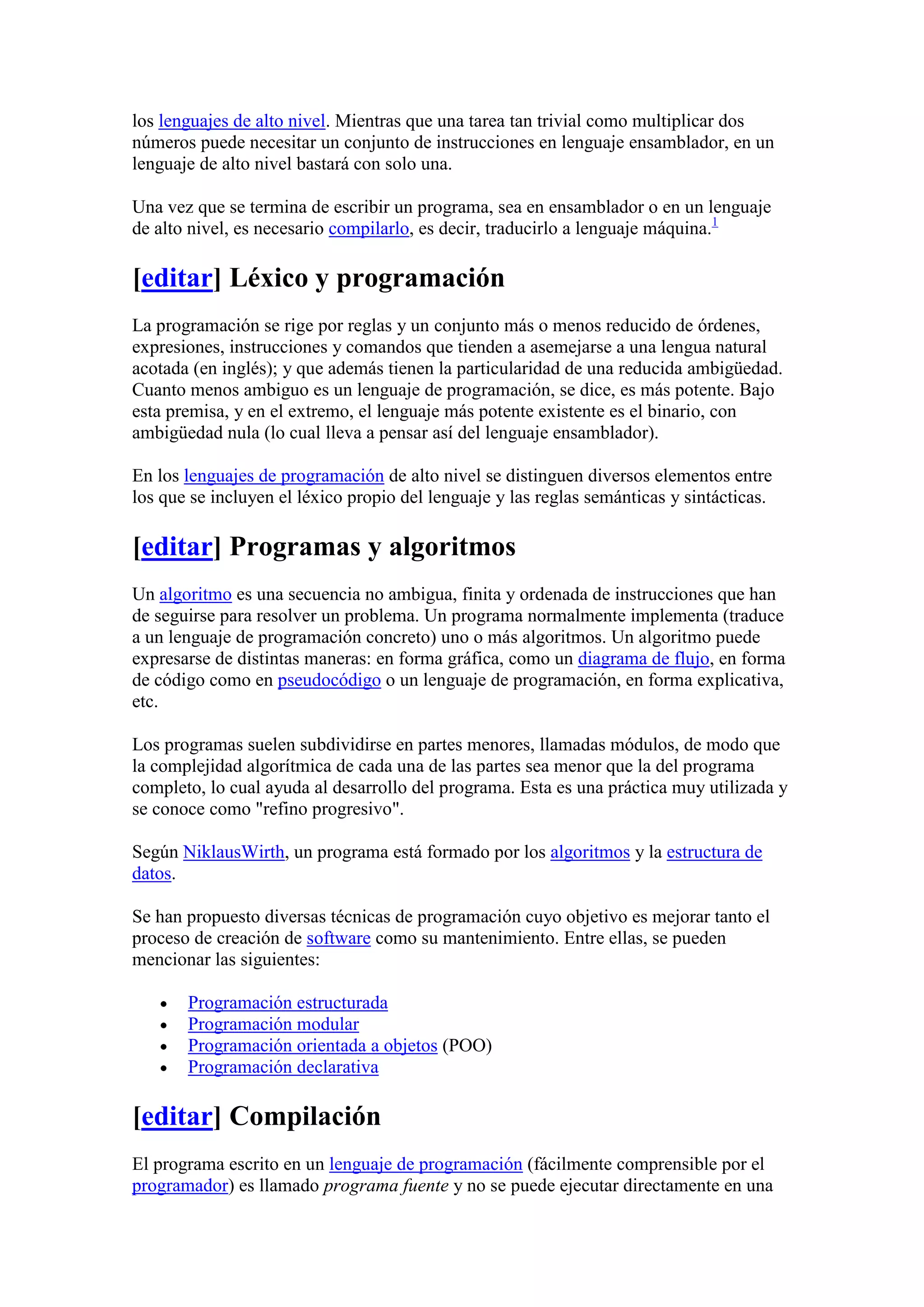 La programación es el proceso de diseñar, codificar, depurar y mantener programas computacionales escritos en un lenguaje de programación. El propósito de la programación es crear programas que exhiban un comportamiento deseado mediante el uso de algoritmos y lógica formal. La programación involucra el uso de lenguajes de programación como ensamblador o lenguajes de alto nivel, y el proceso generalmente incluye la compilación del código fuente en código ejecutable.