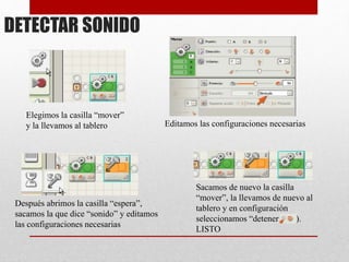 Este documento describe cómo programar un robot NXT para detectar sonidos usando un sensor de sonido. Explica cómo configurar las casillas "mover", "espera" y "bifurcación" para que el robot identifique cualquier sonido y realice un movimiento, y cómo configurar el sensor de sonido y el tiempo de espera deseado.