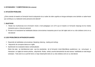 Este documento presenta la programación para el núcleo de Humanismo y Comunicación, disciplina de Inglés Básico del primer semestre de Bachilleres Académicos en la Escuela Normal Superior de Corozal para el año 2010. La programación incluye 2 unidades didácticas que buscan desarrollar las habilidades comunicativas en inglés de los estudiantes a través de conceptos y actividades básicas, para que puedan utilizar el inglés en su vida diaria y laboral como maestros.