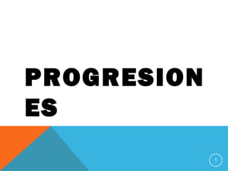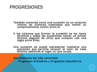 Este documento describe diferentes tipos de progresiones matemáticas, incluyendo progresiones aritméticas y geométricas. Una progresión aritmética es una sucesión de números donde cada término se obtiene sumando una cantidad constante al anterior, mientras que una progresión geométrica es una sucesión donde cada término se obtiene multiplicando el anterior por una razón constante. También explica el cálculo de intereses simple y compuesto sobre un capital invertido.
