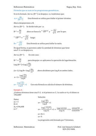 Este documento presenta una introducción a las progresiones geométricas, incluyendo su definición, fórmulas para calcular términos individuales, razones, sumas y su aplicación para resolver problemas. Se explican conceptos como término n-ésimo, interpolación de medios geométricos y uso de progresiones geométricas para modelar situaciones de la vida real.