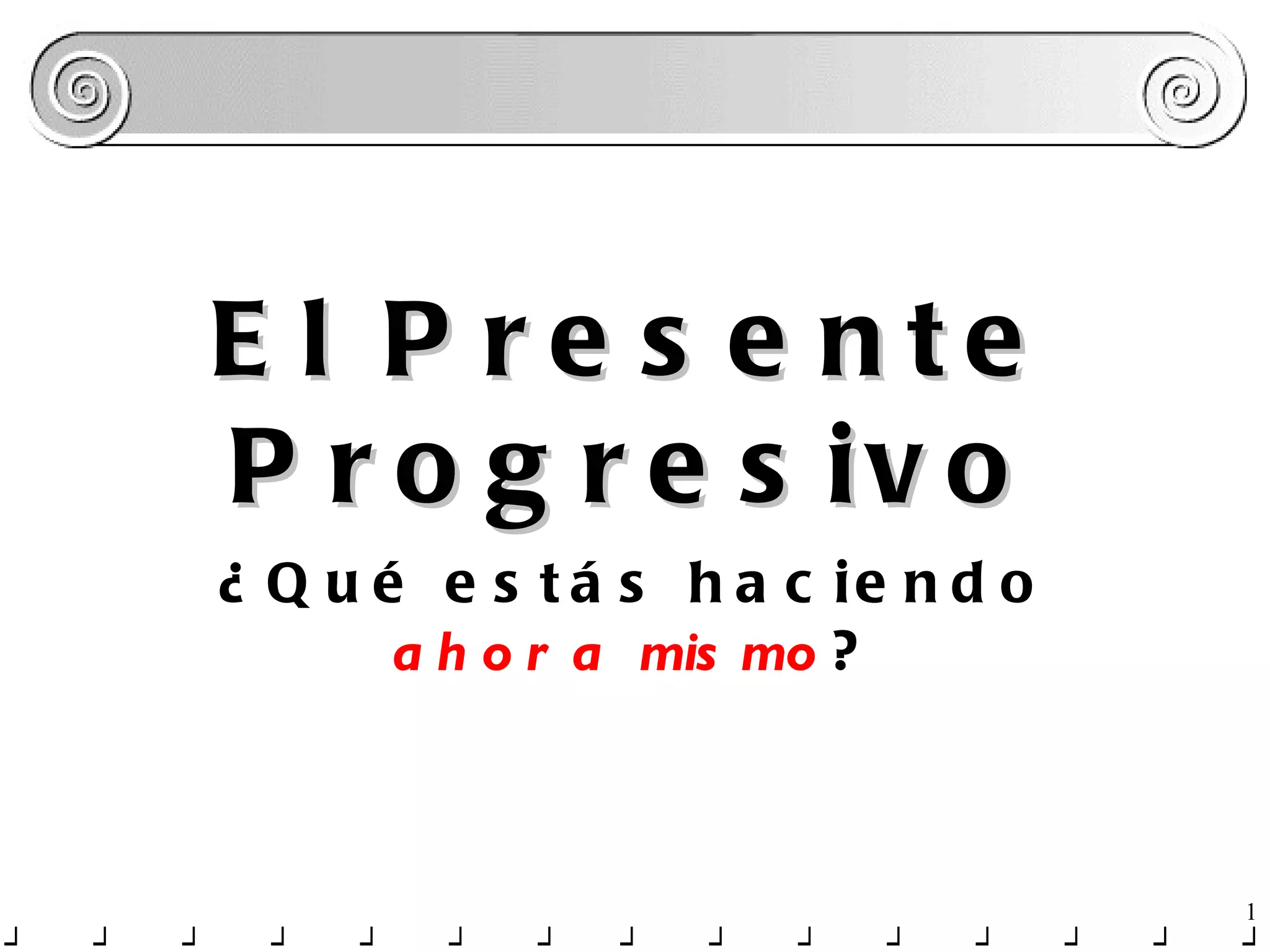 El documento explica el uso del presente progresivo en español. Describe cómo se forma agregando el verbo "estar" y el participio presente de los verbos regulares e irregulares. Proporciona ejemplos de oraciones en el presente progresivo y ejercicios para practicar la formación y el uso de este tiempo verbal.