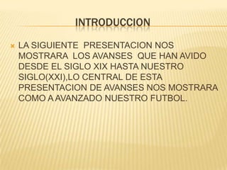 Este documento presenta los avances en el fútbol desde el siglo XIX hasta el siglo XXI, comparando elementos clave como el balón, los uniformes, los guantes para arqueros y los estadios a través de los tiempos. Concluye que sin estos avances aún estaríamos usando la equipación y infraestructura del siglo XIX.