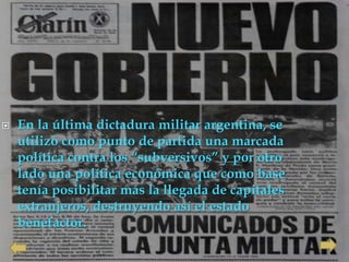 El documento resume la última dictadura militar en Argentina entre 1976 y 1983. Implementó una política económica que favoreció a empresas extranjeras y destruyó el estado de bienestar, al tiempo que perseguía a disidentes políticos mediante el terrorismo de estado, incluyendo el secuestro y desaparición de 30.000 personas. La dictadura también censuró artistas y expulsó profesionales, violando los derechos humanos hasta que su derrota en la guerra de las Malvinas marcó el fin del régimen y el ret