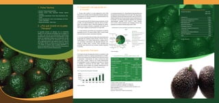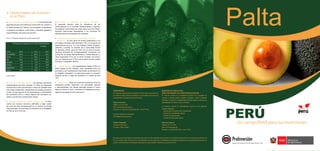 El documento proporciona información sobre las oportunidades de inversión en el cultivo de aguacates en Perú. Perú ofrece altos rendimientos y calidad en el aguacate, condiciones climáticas óptimas para el cultivo durante todo el año, y mano de obra calificada y de bajo costo. Además, Perú tiene acceso preferencial a los principales mercados mundiales a través de varios acuerdos comerciales, y el aguacate peruano tiene oportunidades para expandirse en mercados como Estados Unidos y