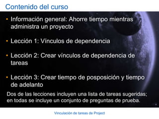 Este documento presenta un curso sobre la vinculación de tareas en Microsoft Project 2007. Explica los cuatro tipos de dependencias de tareas (comienzo a comienzo, fin a comienzo, fin a fin y comienzo a fin) y cómo crear vínculos entre tareas. El curso consta de tres lecciones que cubren la introducción a los vínculos de tareas, los diferentes tipos de dependencias y cómo crear vínculos de dependencia entre tareas específicas. El documento incluye preguntas de prueba al final de cada lección para