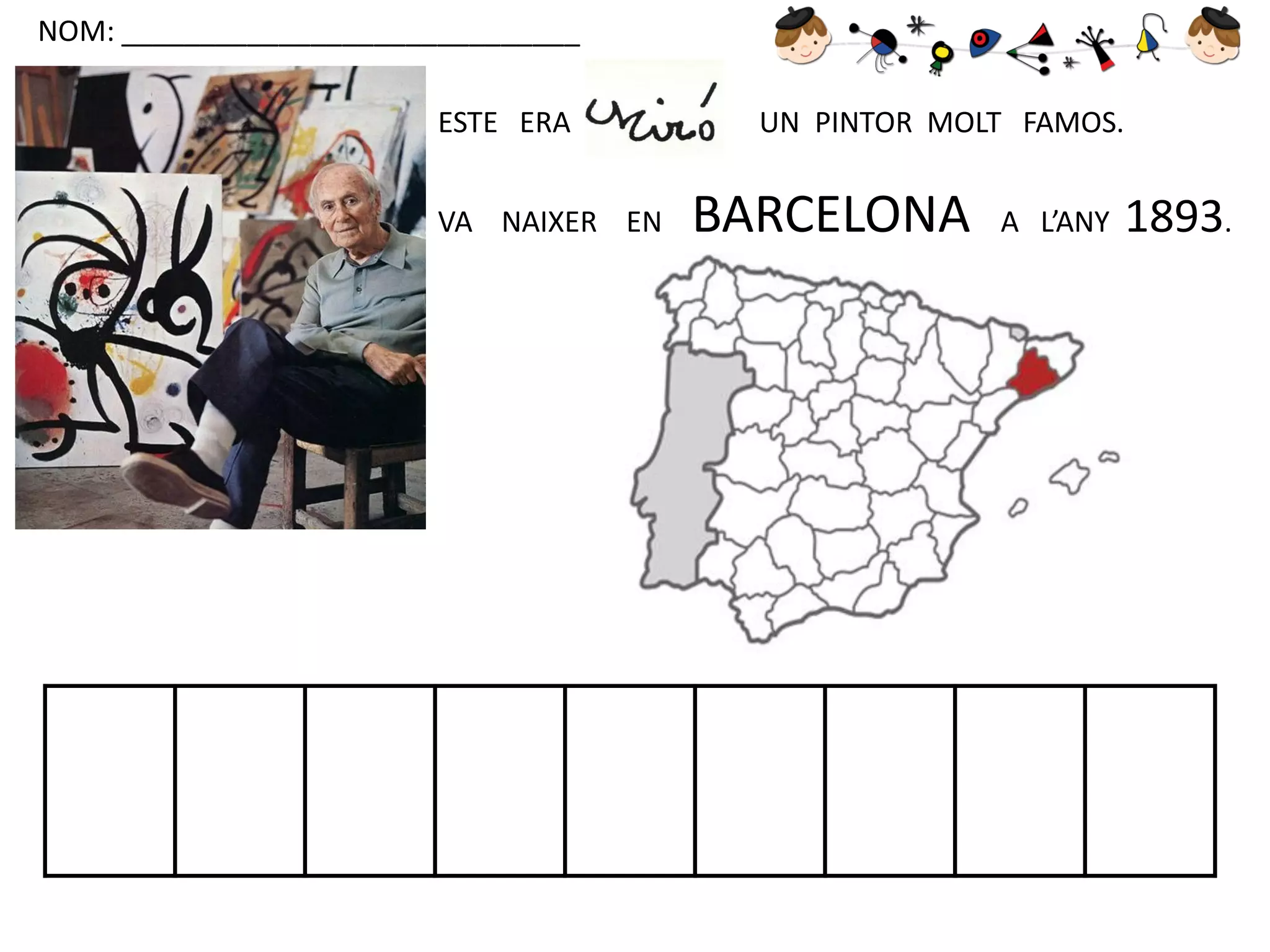 Este documento proporciona información biográfica sobre el pintor español Joan Miró en forma de actividades y ejercicios. Habla de su lugar y fecha de nacimiento en Barcelona en 1893, su educación artística y sus principales colores y formas preferidas. También menciona su matrimonio, su mudanza a París y luego a Mallorca, y su estilo surrealista de pintar las cosas como las siente en lugar de cómo se ven.