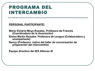 Este documento describe el itinerario de un intercambio estudiantil entre un instituto español y un colegio francés. Los estudiantes españoles pasarán 11 días en Francia visitando lugares como Saint-Rémy-de-Provence, Gordes, Arlés y Baux-de-Provence, y se hospedarán con familias francesas. El programa incluye visitas culturales, asistencia a clases en el colegio francés y tiempo libre con las familias anfitrionas.