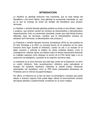 Un prolactinoma es un adenoma de la hipófisis que causa niveles elevados de prolactina en la sangre y síntomas como galactorrea e infertilidad. Los prolactinomas pueden ser microadenomas pequeños o macroadenomas grandes. Se pueden detectar mediante resonancia magnética o tomografía y midiendo los niveles de prolactina. La causa exacta no se conoce, pero investigaciones recientes han encontrado marcadores genéticos y métodos de detección mejorados que ayudan a comprender y tratar esta afección.