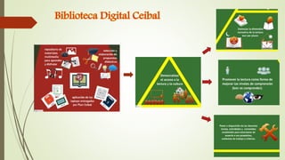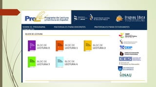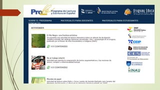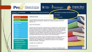 El documento habla sobre la enseñanza de la lengua española, el fortalecimiento de la lectura y el abordaje de textos literarios. También menciona la organización de talleres de lectura y escritura, el uso de recursos educativos como PROLEE, bibliotecas solidarias y Ceibal. Finalmente, proporciona enlaces a páginas sobre bibliotecas mínimas y catálogos de libros recomendados para niños.