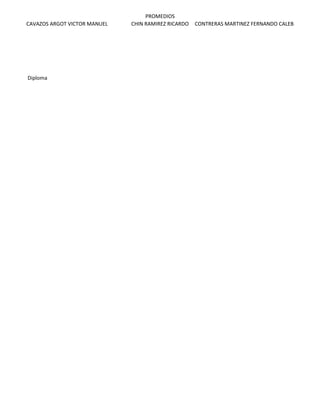 Este documento presenta los nombres, apellidos y calificaciones de 15 estudiantes. Incluye sus calificaciones en 3 materias diferentes y su promedio general. El documento es un reporte de calificaciones emitido por el Instituto Educativo de Calidad de la Enseñanza Media Superior.