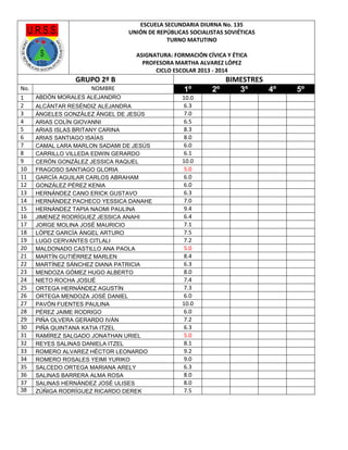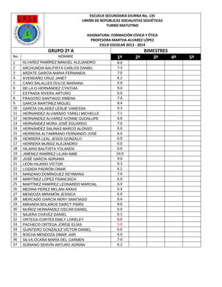 Este documento presenta los listados de alumnos de cuatro grupos (2o A, 2o B, 2o C, 2o D, 2o E) de la Escuela Secundaria Diurna No. 135 en la Unión de Repúblicas Socialistas Soviéticas para el ciclo escolar 2013-2014. Cada lista incluye el nombre y calificaciones del primer bimestre de cada alumno. La profesora de la asignatura de Formación Cívica y Ética es Martha Álvarez López.