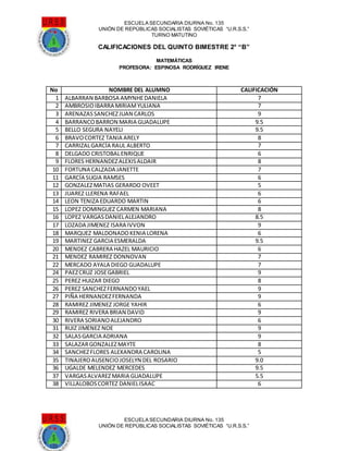 Este documento presenta las calificaciones del quinto bimestre de matemáticas de tres grupos (2° "A", 2° "B" y 2° "C") de la Escuela Secundaria Diurna No. 135 de la Unión de Repúblicas Socialistas Soviéticas. Se lista el nombre y calificación de cada estudiante, con calificaciones que van de 5 a 10. La profesora de matemáticas fue Irene Espinosa Rodríguez.