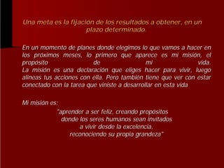 Este documento presenta una discusión sobre las metas y promesas. Habla sobre la importancia de establecer metas claras y alineadas con la misión y propósito de vida de cada persona. También destaca la diferencia entre objetivos y deseos, y la necesidad de crear planes de acción concretos para alcanzar las metas deseadas. Finalmente, ofrece consejos sobre cómo superar obstáculos, mantenerse enfocado y perseverar hasta lograr el éxito deseado.