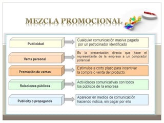 La promoción se define como el conjunto de actividades que informan y persuaden al público sobre productos y marcas, crucial para el reconocimiento y la competencia en el mercado. Las estrategias promocionales, que incluyen enfoques como 'push' y 'pull', tienen como objetivo aumentar la conciencia, el conocimiento, la preferencia y la convicción del consumidor. El ciclo de vida del producto y la imagen del mismo son factores clave que influyen en las decisiones de promoción.