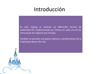 Disney utiliza principalmente publicidad ATL (por encima de la línea) a través de televisión, radio, periódicos, paradas de autobús y anuncios espectaculares. Disney World atrae a los visitantes con elementos visuales grandes como castillos y luego los guía a atracciones más cercanas, siguiendo la estrategia de "weenie" de Walt Disney. La campaña "Let the memories begin" busca crear experiencias memorables. El canal Disney también promociona una amplia gama de productos licenciados. La publicidad impresa de Disney evoca sent