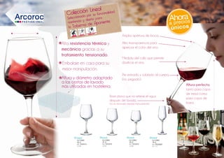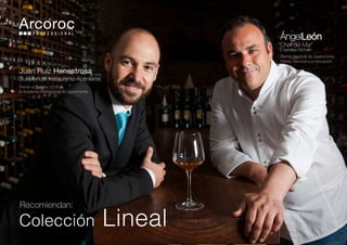 Este documento describe la colección de copas de vino Lineal creada por Juan Ruiz Henestrosa, sumiller galardonado del restaurante Aponiente. La colección incluye copas de diferentes tamaños entre 18-45 cl y se caracteriza por su funcionalidad, resistencia y diseño minimalista con una amplia apertura, alta transparencia, base plana y pie estirado y soldado.