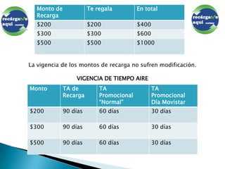 POR TEMPORADA NAVIDEÑA,NUESTRASRECARGAS A PARTIR DE$200 TE DAN EL DOBLE!!Vigencia: Del 2 de diciembre 2010 al 6 de Enero de 2011En esta época navideña Movistar otorga el doble de Tiempo Aire en la oferta de recarga actual. De acuerdo a lo siguiente: 1. Se modifican los montos de la oferta de recarga con el propósito de Otorgar mayores beneficios al cliente, quedando de la siguiente forma: