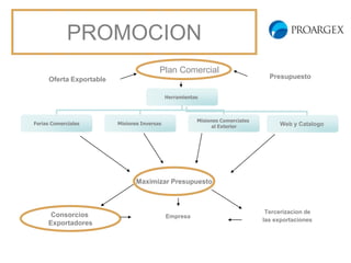 Este documento presenta varias estrategias para la internacionalización de alimentos, incluyendo participar en ferias comerciales, realizar misiones comerciales al exterior y recibir misiones inversas, desarrollar un sitio web y catálogo de productos, formar consorcios exportadores, tercerizar exportaciones, y trabajar en el mercado extranjero capacitando vendedores y promoviendo los productos a través de ferias y visitas a clientes.