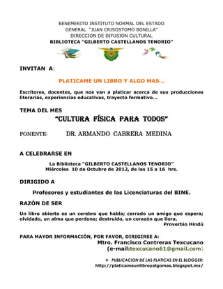 Este documento anuncia una presentación en la Biblioteca "Gilberto Castellanos Tenorio" del Benemérito Instituto Normal del Estado. El 10 de octubre de 2012 a las 15 horas, el Dr. Armando Cabrera Medina hablará sobre "Cultura Física para Todos". La presentación está dirigida a profesores y estudiantes de las licenciaturas del instituto y forma parte de una serie de charlas llamada "Platicame un Libro y Algo Más...".