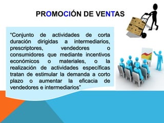 El documento presenta información sobre la promoción de ventas dirigida a intermediarios, prescriptores, vendedores y consumidores con el objetivo de estimular la demanda a corto plazo. Se describen diferentes herramientas de promoción de ventas como cupones, descuentos, bonificaciones, muestras gratuitas, concursos y exhibidores en puntos de venta, así como sus ventajas y desventajas. También se exponen los objetivos de la promoción de ventas para cada grupo objetivo.