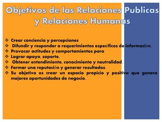 El documento describe las relaciones públicas y su planeación. Las relaciones públicas buscan crear conciencia, difundir información, provocar actitudes y comportamientos para lograr apoyo y entendimiento. Su objetivo es crear un espacio positivo que genere oportunidades de negocio. La planeación de relaciones públicas implica determinar los recursos y tareas necesarios para comunicarse con audiencias internas y externas de una manera estratégica y alineada con los objetivos de la organización.