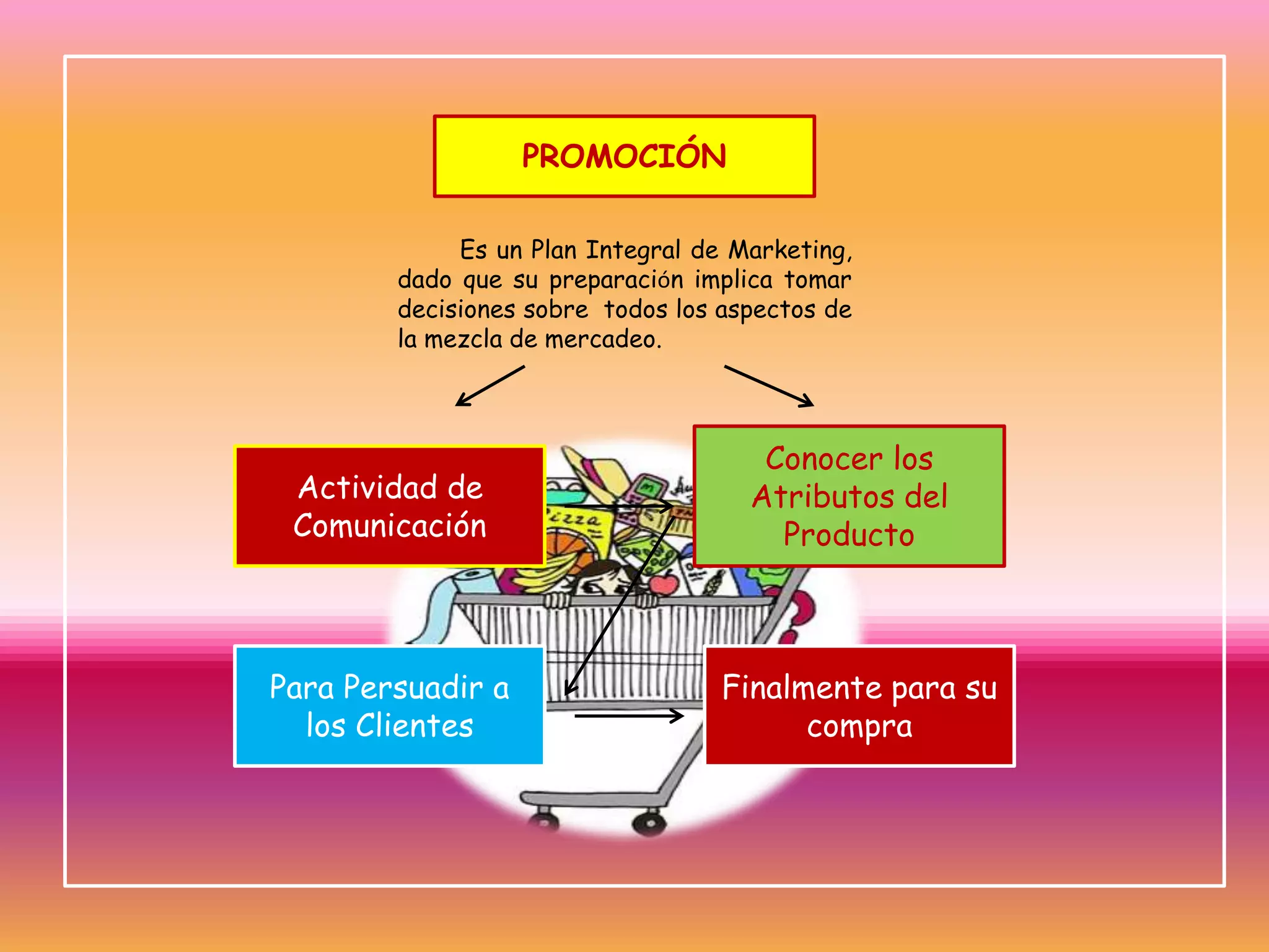 El documento habla sobre la promoción como un plan integral de marketing que implica decisiones sobre todos los aspectos de la mezcla de mercadeo. La promoción busca comunicar los atributos de un producto para persuadir a los clientes y lograr su compra final. También puede tener objetivos estratégicos como motivar un comportamiento futuro ofreciendo un nuevo producto. Las promociones se pueden clasificar según su orientación a distribuidores, consumidores, personal o según su tipo como muestras, 2x1, regalos u ofertas de canje.