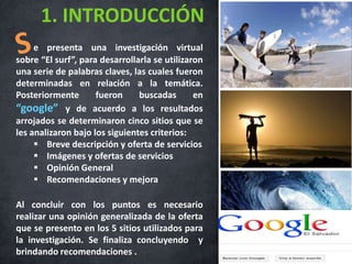 Este documento presenta los resultados de una investigación sobre la oferta turística relacionada al surf en El Salvador encontrada en 5 sitios web. Se analizaron los sitios considerando su descripción, imágenes, opinión general y recomendaciones. La conclusión fue que la oferta es amplia pero se enfoca más en actividades de ocio que en el deporte. Se recomienda actualizar los sitios con más frecuencia e incluir información para todos los niveles sobre el surf.