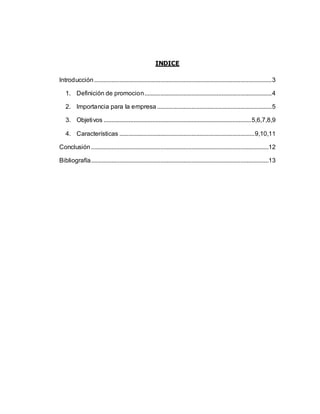 Este documento presenta información sobre las promociones y su importancia para las empresas. Define la promoción, discute sus objetivos principales como informar, persuadir y recordar, y describe cinco características clave que deben cumplir las promociones: ser impactantes, mecánicas sencillas, cuantificables, coherentes con la cultura local y rentables. Concluye que las promociones son una herramienta importante de marketing para dar a conocer productos y servicios y aumentar las ventas de una empresa.
