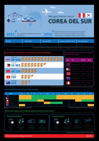 Este documento proporciona información logística y requisitos para exportar mangos desde Perú a Corea del Sur, incluyendo los tiempos y costos de transporte marítimo y aéreo, los principales proveedores de mangos a Corea del Sur, la estacionalidad de suministro por país, los tratamientos requeridos para la entrada de mangos, y los aranceles aplicados a las importaciones de mangos peruanos. También resume brevemente los hitos en el inicio de las exportaciones de mangos peruanos a Corea del Sur en 2015-2016.