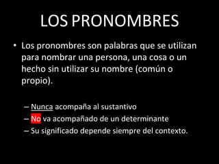 El documento describe los pronombres y los verbos. Explica que los pronombres sustituyen a sustantivos y coinciden en género y número, mientras que los determinantes acompañan a sustantivos. También clasifica diferentes tipos de pronombres como demostrativos, personales, relativos y posesivos. Finalmente, describe las características de los verbos como el tiempo, modo, número y persona, y explica los diferentes tiempos verbales como presente, pretérito e imperfecto.