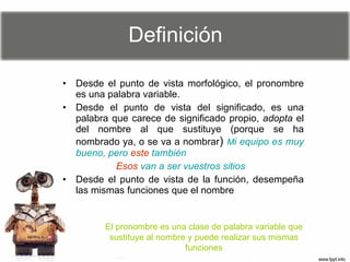 Este documento define y clasifica los diferentes tipos de pronombres en español. Explica que los pronombres sustituyen a los nombres y pueden realizar las mismas funciones. Luego describe los pronombres personales, posesivos, demostrativos, indefinidos, numerales, exclamativos e interrogativos, indicando sus características gramaticales como variaciones de género y número.