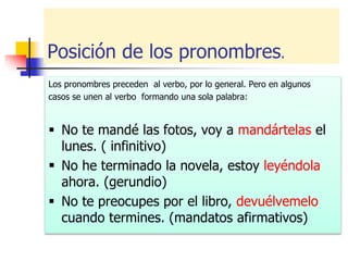 Este documento explica el uso de pronombres de complemento indirecto en español al traducir desde el inglés. Explica que los pronombres indirectos generalmente preceden al verbo y a veces se unen a él. También cubre el uso de pronombres directos e indirectos en la misma oración, y cómo "le" y "les" se cambian a "se" en algunos casos. Además, discute las diferencias entre el uso de pronombres indirectos en español versus inglés, y algunos problemas comunes de traducción relacionados con pronombres indirectos. Finalmente,