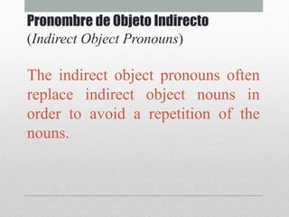 Este documento explica el uso de pronombres de objeto indirecto en español. Indica que estos pronombres reemplazan sustantivos de objeto indirecto para evitar repeticiones. Proporciona las formas singulares y plurales de los pronombres de objeto indirecto y ejemplos de su uso, incluyendo cuando se combinan con pronombres de objeto directo. Finalmente, incluye oraciones de práctica para reforzar el concepto.