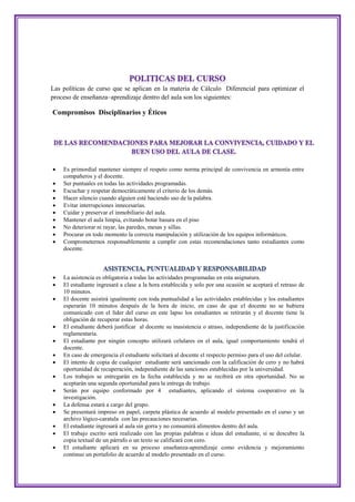 El documento describe un curso de Cálculo Diferencial con 4 créditos. Incluye información sobre el título del curso, código, créditos, horas de contacto, objetivos, temas, horario, texto de referencia, evaluación y responsable. El curso busca que los estudiantes aprendan conceptos como límites, derivadas y sus aplicaciones a través de ejercicios y el uso de software matemático.