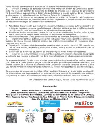 Este documento expresa la preocupación de organizaciones de la sociedad civil en Chiapas, México por la protección de los derechos de niñas, niños y adolescentes durante situaciones de emergencia causadas por desastres naturales. Señala que las comunidades afectadas, especialmente las marginadas, no reciben apoyo adecuado durante las emergencias y que los mecanismos de atención no aseguran el bienestar psicoemocional de los menores. También indica la falta de datos desagregados sobre el impacto de los desastres en la inf